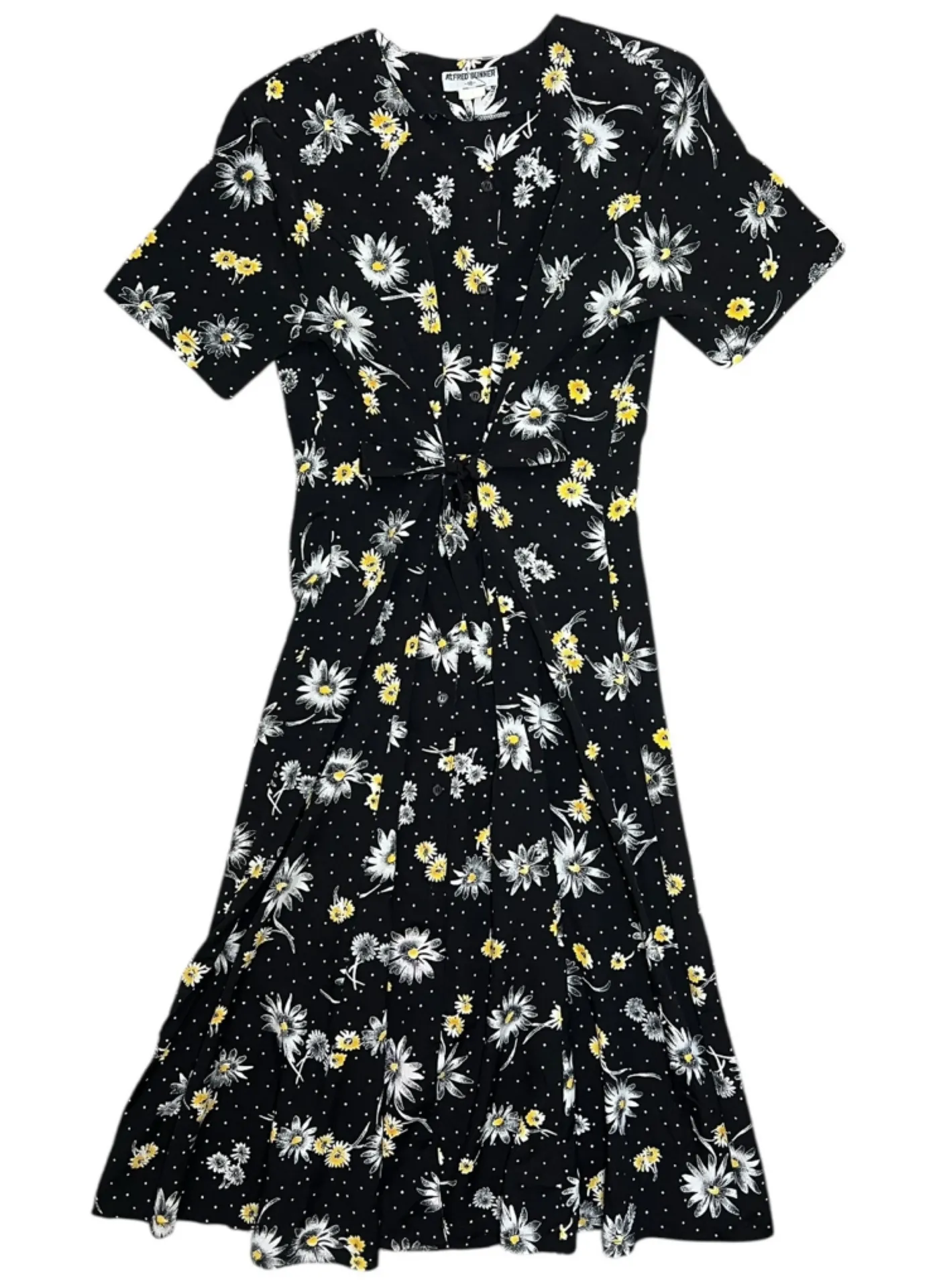 Vintage daisy print with polka dots on a black background Color Palette: The dominant colors are black, white, and yellow, creating a classic and cheerful contrast. Style Elements: The dress is a midi-length, maxi depending on your height, button front short-sleeved style with a V-neckline and a tie-front detail, suggestive of a casual or daytime wear aesthetic. Relaxed Silhouette: The overall cut of the dress, with its short sleeves and flowy skirt, suggests comfort and a less formal, more natural look Approximate measurements laying flat Pit to pit 20 inches Length 49 inches No care tag but the words under the label show “yon” so I presume it was made of rayon