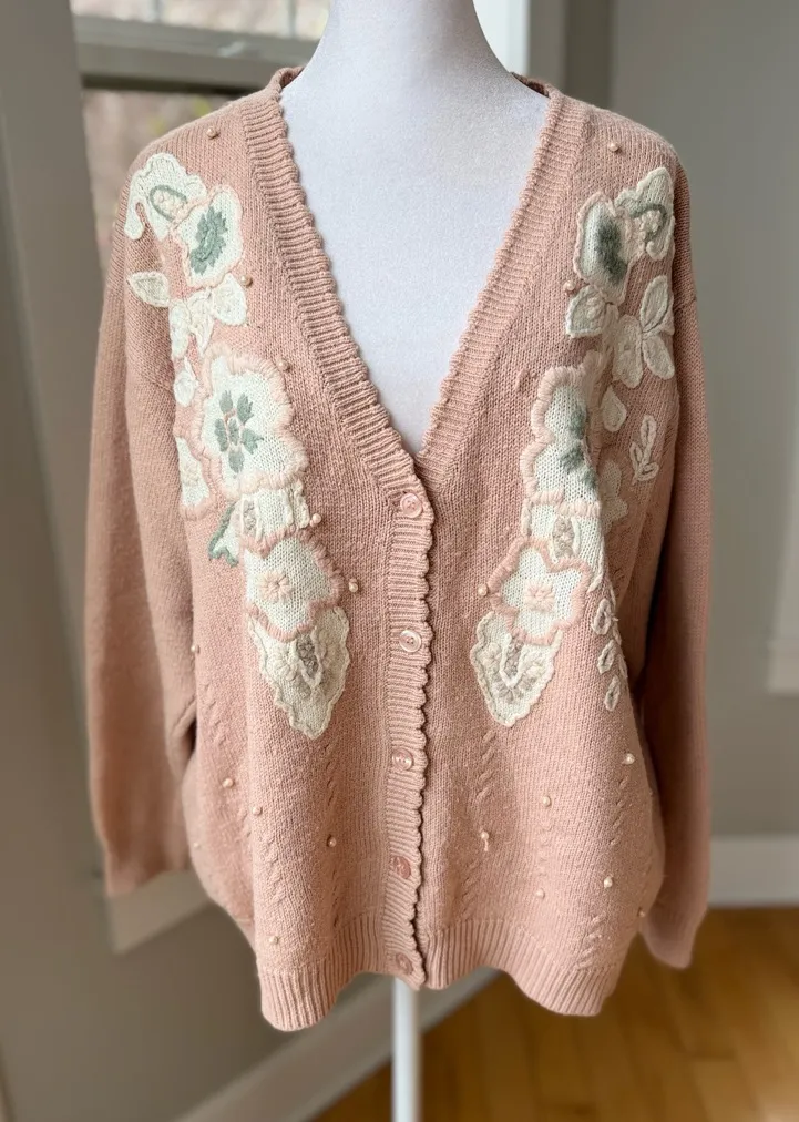 The sweetest vintage Alfred Dunner pink v neck sweater with floral appliqués, pearls, and scalloped edging. Missing one pearl as shown in pic. Not noticeable when worn and easily replaced. Otherwise excellent vintage condition. Measurements in pics. Size Large.