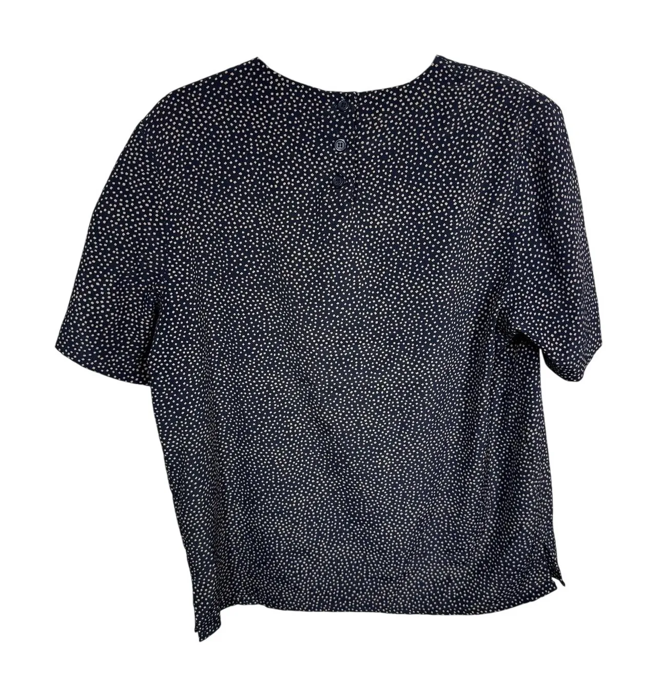 Vintage Alfred Dunner Women's Navy Beige Polka Dot Short Sleeve Blouse Sz 10 Description: Vintage Alfred Dunner women's short sleeve blouse in navy with beige abstract polka dot print. Lightweight 100% polyester with a modest neckline, side slits, and button closure on the back. Great for work or casual wear. Gently worn, no major flaws. Approx. measurements: 26" length, 21.5" chest. Size 10.