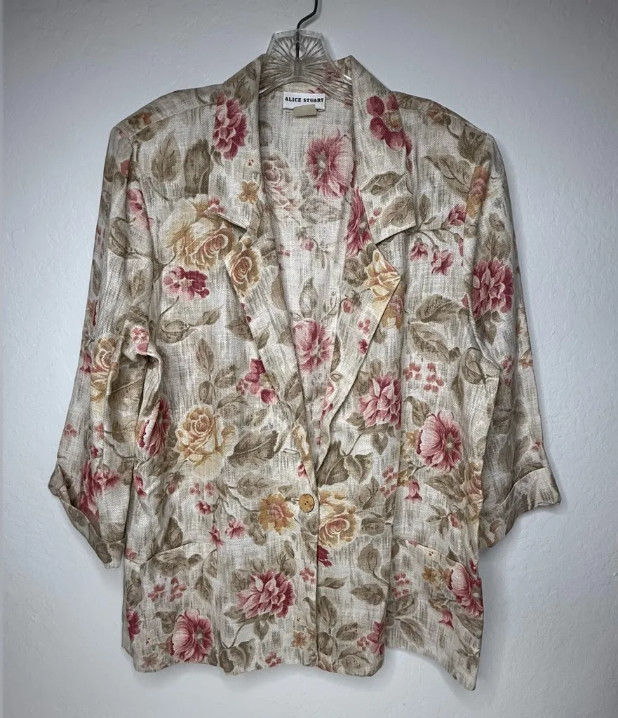 READ FULL DESCRIPTION: Pre-owned/ gently used/ excellent used condition/ like new Jacket is lightweight and feels like a canvas from the linen blend. It has two pockets and one button to close. Shoulder pads are present. Very nice vintage blazer. Size is: Large - see pics for condition - see pics for measurements - in a smoke free home - in a home with pets - Excellent condition - color disclosure: color may differ in pics than actual color due to flash, lighting, shadows etc. ***if you purchase this item and are satisfied, please remember to leave a review and I will do the same for you. If you have any issues please contact me so I can correct it for you, before leaving a bad review. Thank you!