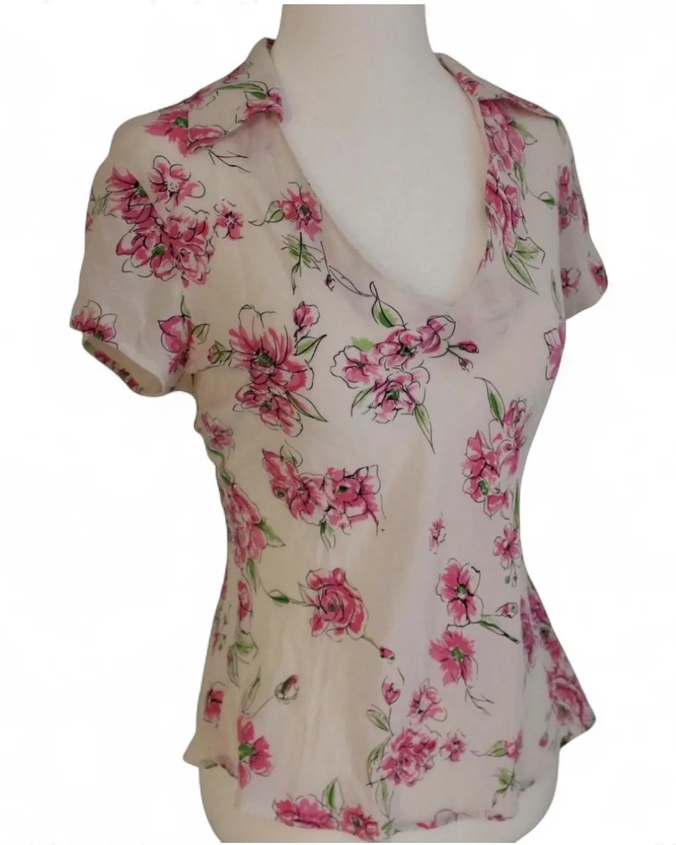 Allison Taylor women's short sleeve v-neck blouse featuring a delicate pink and green floral print on a cream background. This elegant top offers a flattering silhouette with a subtle collar and a flowy hemline, perfect for adding a touch of femininity to your wardrobe. Type: Blouse Department: Women Material: Silk Neckline: Collared Sleeve Length: Short Sleeve Pattern: Floral Features: Lightweight Fit: Slim Occasion: Casual, Party/Cocktail Closure: Pullover Season: Spring, Summer Keywords: silk, floral, blouse, women, v-neck, short sleeve, feminine, lightweight, designer, print, casual, daytime, elegant, vintage, 90s, cottagecore Pre-owned in good condition with plenty of life left see all photos for condition, signs of wear and measurements. As with all pre-owned items please expect minor signs of wear.