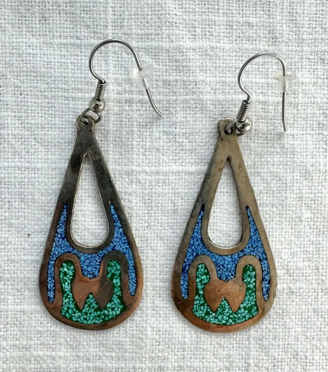 Adorn your ears with the vibrant artistry of these Alpaca Mexico teardrop earrings. Captivating mosaic patterns of bright blue and earthy green stones dance within a sleek, polished frame, creating a striking visual statement. The unique teardrop silhouette offers a graceful swing with every movement, while the intricate inlay work hints at skilled craftsmanship. These earrings are perfect for adding a pop of color and artisanal flair to any outfit, whether you're enjoying a casual brunch or attending a lively fiesta. Style: Dangle/Drop Main Stone Color: Blue Ethnic & Regional Style: Mexican Metal: Silver Type: Earrings Material: Enamel, Stone Ear Area: Lobe Department: Unisex Adults Keywords: Southwestern, Mexican, Artisan, Handmade, Boho, Chic, Statement, Gemstone Inlay, Travel, Unique, Fashion, Accessories, Gift