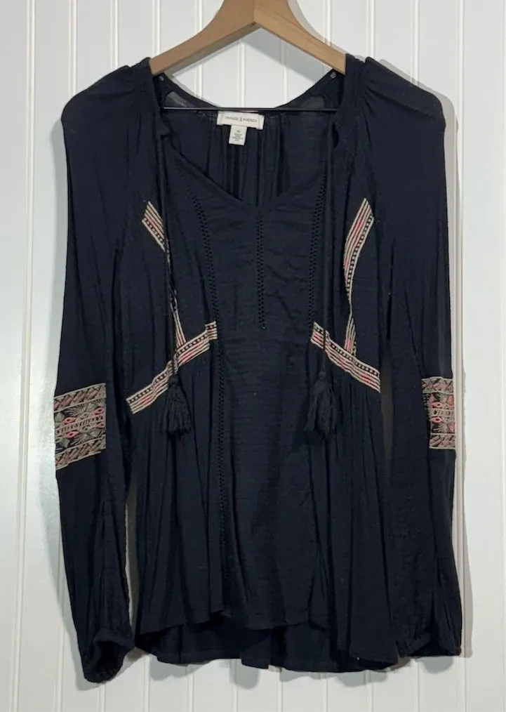 Embrace the surging Boho Chic aesthetic with this gorgeous peasant top from Vintage America! The black color makes this classic silhouette look refined and polished, perfect for the modern bohemian style. This blouse features intricate multi-color tribal/geometric embroidery accents on the chest and sleeves, elevating it beyond a simple basic. The fabric is a soft, draping 100% Viscose knit, providing the perfect flow and movement desired in the modern boho look. Aesthetic Match: • Boho Chic Revival: The relaxed silhouette, tassel ties, and authentic embroidery are core elements of the elegant boho style trending now. • Festival/Artisan: The tribal/folkloric embroidery and subtle pintuck pleating lend a handcrafted, worldly feel. • Transitional Staple: The black color and long sleeves make it ideal for pairing with wide-leg jeans, leather jackets, or suede pieces for a polished fall/winter boho look. Key Features: • Fabric: Soft, flowy 100% Viscose knit. • Details: V-neck with tassel tie closure, pintuck pleating down the bodice, and striking embroidered bands on the sleeves. • Fit: Relaxed, flowing body with blouson long sleeves ending in elasticated cuffs. Peasant Top, Boho Blouse, Bohemian Chic, Embroidered, Tunic, Tassel Tie, Tribal, Geometric, Viscose, Black Top, Hippie, Festival, Folkloric, Artisan, Long Sleeve