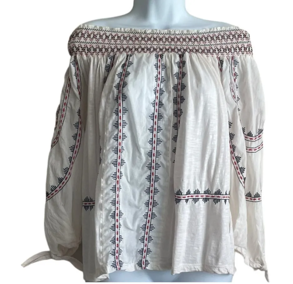 Vintage America Blues Women Top S Ivory 3/4 Sleeve Embroidered Boho Festival Great Pre-Owned Condition - See Pictures for Details Features:: (First picture truest color) -lightweight -off or on the shoulder -semi sheer -gauzy fabric -ties at end of sleeves -relaxed silhouette -cotton modal blend, machine wash Style Profile: comfortable, easy care, packable, feminine, versatile, stylish, weekend, vacation, travel Approximate Measurements: flat lay: armpit to armpit: 17“ sleeve length: 16“ hemline: 26“ length: 21“ Pet/smoke free home 1-2 day shipping Bundle Discounts on Multiple Items