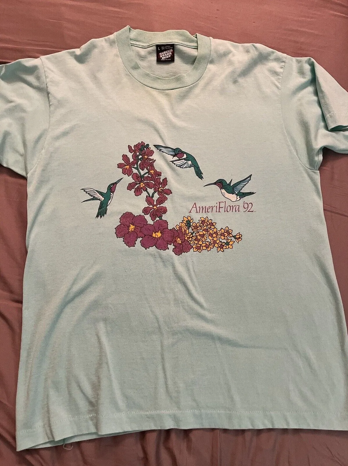 This vintage AmeriFlora 92 shirt is a classic addition to any wardrobe. The short sleeve crew neck t-shirt is made of a comfortable jersey fabric, with a colorful multicolor printing of flowers and birds. The shirt is a size L, and fits true to size with a classic fit for both men and women. The shirt is a blue green pastel color. The shirt is pre-owned and has a vintage feel, adding to its unique character. It was made in the USA by Screen Stars, a renowned brand known for their quality clothing. This shirt is perfect for those who love the USA theme, as well as those who appreciate a one-of-a-kind piece of clothing. Smoke free and pet friendly home. Thanks for shopping by!