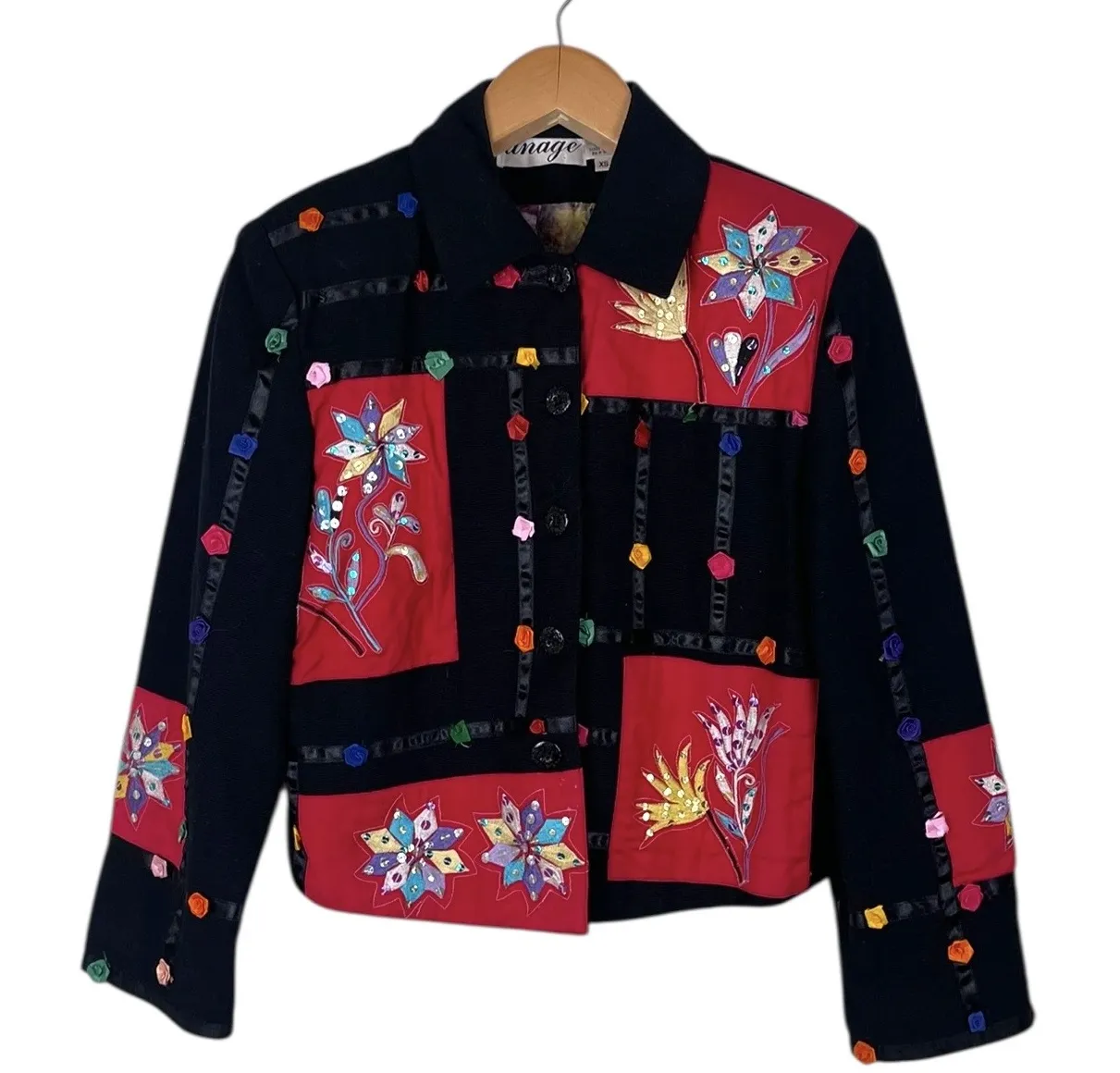 This is a vintage button front jacket from Anage in a women’s size extra small. This jacket has a front pocket, floral embroidery, sequins, and rosettes throughout. I noticed some pulled thread and a couple missing rosettes as pictured. Measurements Pit to Pit: 20 inches Length: 18 1/2 inches 🍑 I have a *SMOKE FRIENDLY* home 🍑 I have a *PET FRIENDLY* home (cat and dog) 🍑 I am open to offers on all of my listings 🍑 I list new items daily Good Condition
