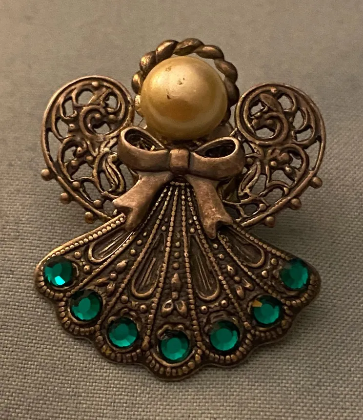 Vintage Angel Brooch Lapel Pin Silver Tone Metal Blue Stones Faux Pearl 1.25” H - $13 - From Terri