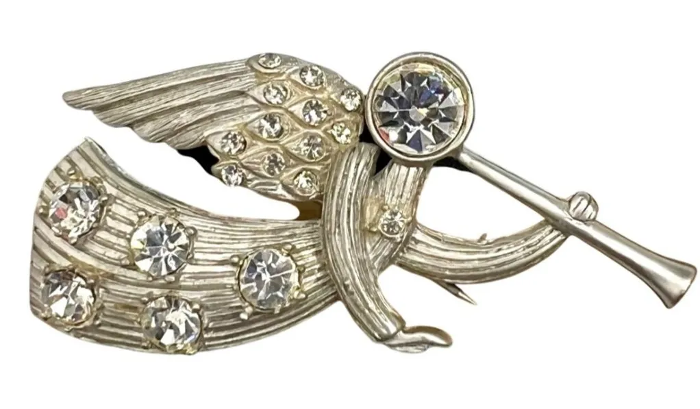 Vintage Angel Pin Brooch With Trumpet & Rhinestones Silver Tone by Silver Starr This angel brooch f... Show more