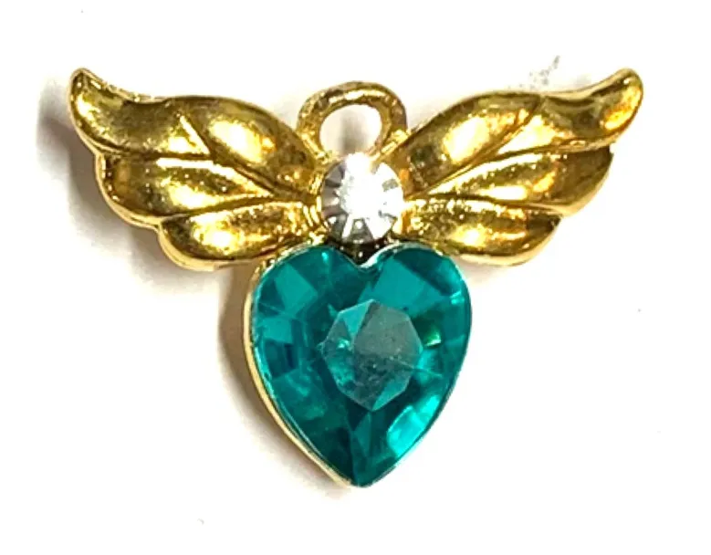 Add a celestial touch to your outfit with this vintage-inspired angel wing brooch. Featuring a brilliant teal heart-shaped rhinestone set in a rich gold-tone frame with detailed wings and a clear accent stone, this piece radiates charm and elegance. A secure pin back makes it easy to style on your blouse, jacket, or bag. Perfect for collectors or as a standout accessory for any look. Not marked, estimated from the late 1980s to early 1990s. Excellent vintage condition. .75” tall .25” wide