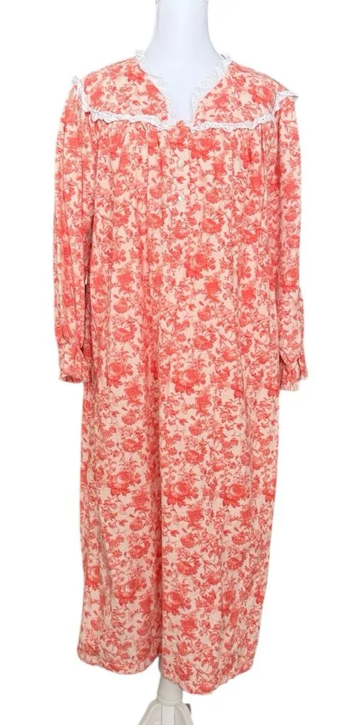 Anthony Richards Vintage Nightgown Housecoat House Dress Muumuu All over floral print Button closure on bodice White eyelet lace trim Ruffled cuffs 100% cotton Made in Pakistan Size MP Chest: approx 22” pit to pit Length: approx 45”