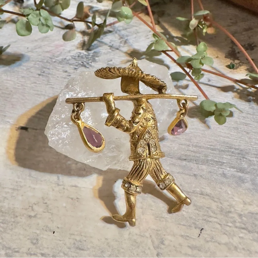Vintage Asian Water Carrier Gold Brooch With Rhinestones and Amethyst Crystal - $120 - From My Sea Of