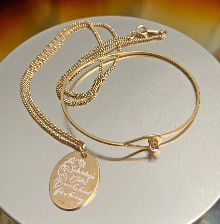 Charming vintage jewelry set by Avon, featuring a gold-tone chain necklace with an engraved “Saturday’s Child works hard for a living” charm paired with a minimalist, dainty gold bracelet. A sweet nostalgic set with classic 80s–90s appeal. Details: • Vintage Avon two-piece set • Gold-tone chain necklace with engraved charm • Slim, dainty bracelet (best fit for a smaller wrist) • Measurements shown in photos • Light tarnishing present in areas, consistent with age This item is part of my $15 select sale — price already reduced. Bundle 2 or more eligible items to receive an automatic discount. This item is shipped simply and sustainably — no excess wrapping, just mindful packaging in a clean poly mailer. Keywords: vintage Avon jewelry, gold necklace, dainty bracelet, quote charm, 80s jewelry, 90s vintage, minimalist gold, nostalgic jewelry, vintage gift