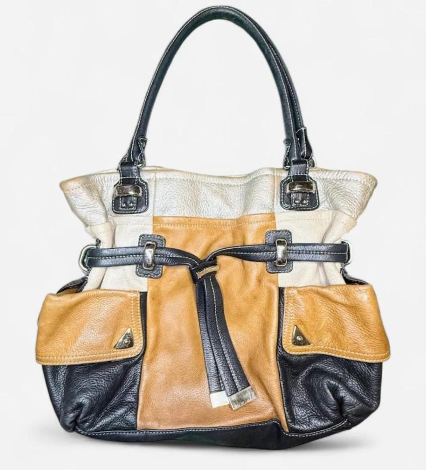 B. Makowsky Colorblock Pebbled Leather Satchel Shoulder Bag in Black, Tan, Cream & Silver This vint... Show more