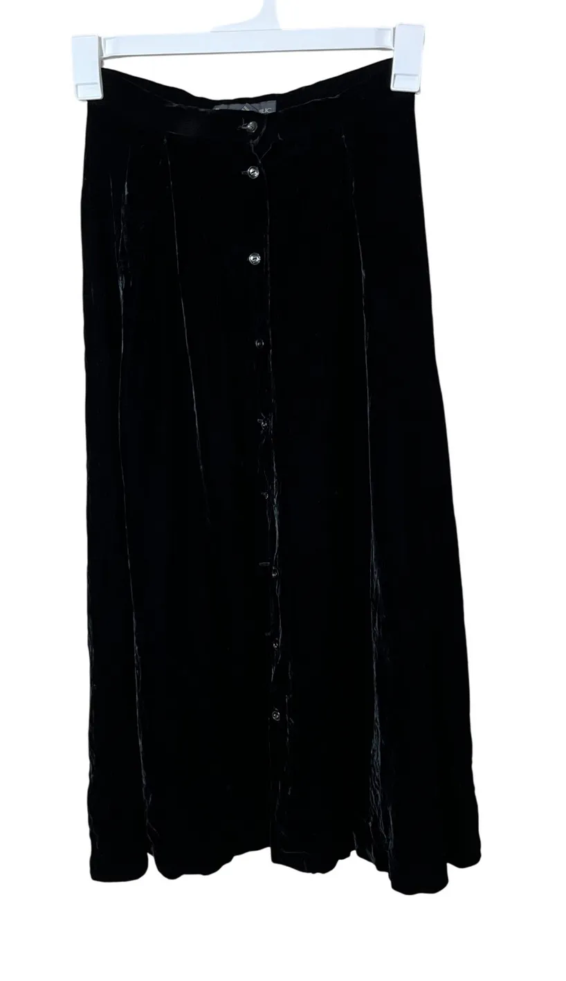 Vintage Banana Republic black velvet maxi skirt with a button-front closure. This elegant skirt feat... Show more