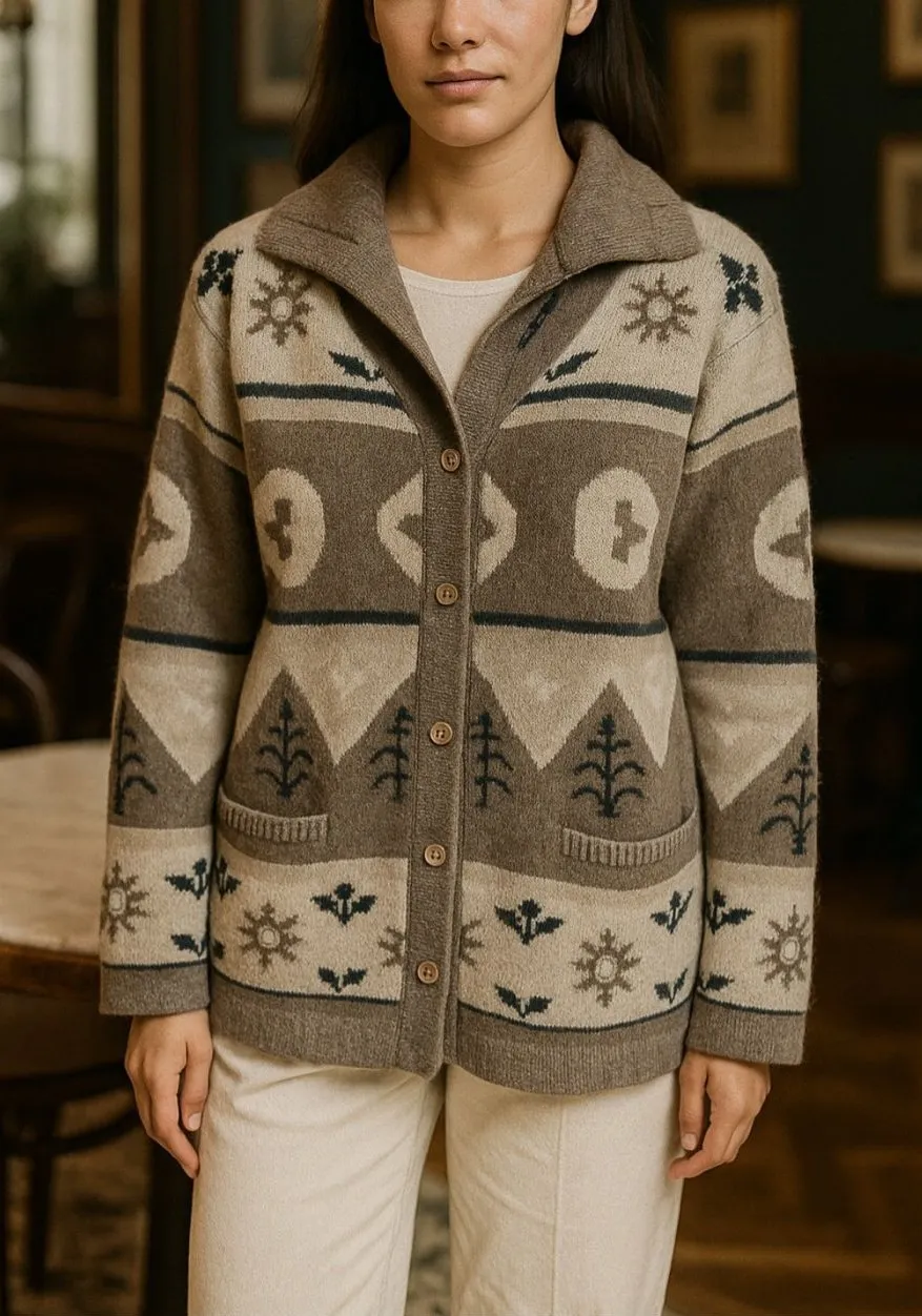 VTG Cozy vintage Bauhinia Cowichan-style cardigan crafted from a warm lambswool, angora, and nylon blend. Features a collared neckline, button-front closure, front patch pockets, and long sleeves with subtle shoulder pads for structure. The neutral taupe and cream palette with nature-inspired motifs gives it a timeless, rustic lodge feel. Details: • Brand: Bauhinia • Size: Medium (see measurements) • Color: Taupe / Cream / Neutral • Material: 70% Lambswool, 20% Angora, 10% Nylon • Style: Cowichan-inspired, collared cardigan • Features: Button front, patch pockets, shoulder pads • Condition: Excellent Perfect for cozy cabin-core, vintage lodge, or après-ski style — layer with denim or leggings for a soft, warm winter look. vintage cardigan, cowichan sweater, angora lambswool blend, grandpa cardigan, rustic knit, mountain lodge, cabin sweater, cottagecore, winter fashion, neutral cardigan, heritage knitwear, 80s vintage sweater, boho winter, unisex cozy knit