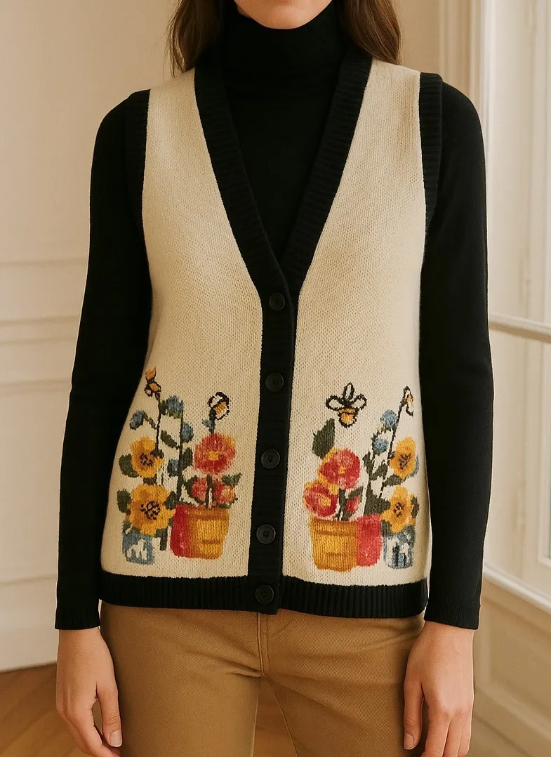 Vintage charm meets modern comfort in this delightful Bechamel knit vest! A canvas of soft cream sets the stage for an enchanting garden scene, where cheerful potted flowers bloom in vibrant hues of yellow, red, and blue, buzzing with embroidered bees. Black trim traces the V-neckline and arm openings, adding a touch of definition to the relaxed silhouette, while button-up closure allows for versatile styling. A piece that offers both visual interest and cozy appeal, this vest will infuse your wardrobe with personality. Perfect for layering over a simple blouse for a casual brunch date, adding a touch of whimsy to your office attire, or cozying up by the fireplace with a good book. Material: Cotton, Ramie, Cotton Blend Features: Button Up, Sleeveless, Garden Print, Embroidered, Knit Size M - runs big/oversized Approx Measurements: bust: 21.5" pit to pit flat across length: 25" shoulder to bottom hem Gently preloved condition Keywords: Knit vest, Floral vest, Bechamel vest, Cream vest, Black trim vest, Sleeveless sweater, Button up vest, Garden print, Embroidered bees, Vintage style, Retro vest, Casual vest, Layering piece, Medium size