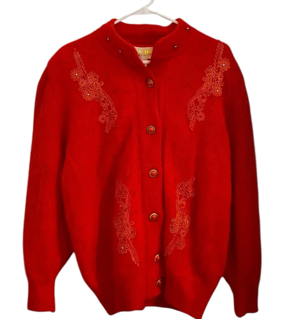 Elegant red sweater with pearls & rhinestones intricate floral embroidery appliqués Perfect for adding a touch of Vintage Charm & sophistication to your wardrobe.. B0112325 37-42 “waist band 25” pit to pit 28” long christmas sweater , statement sweater , beautiful cardigan
