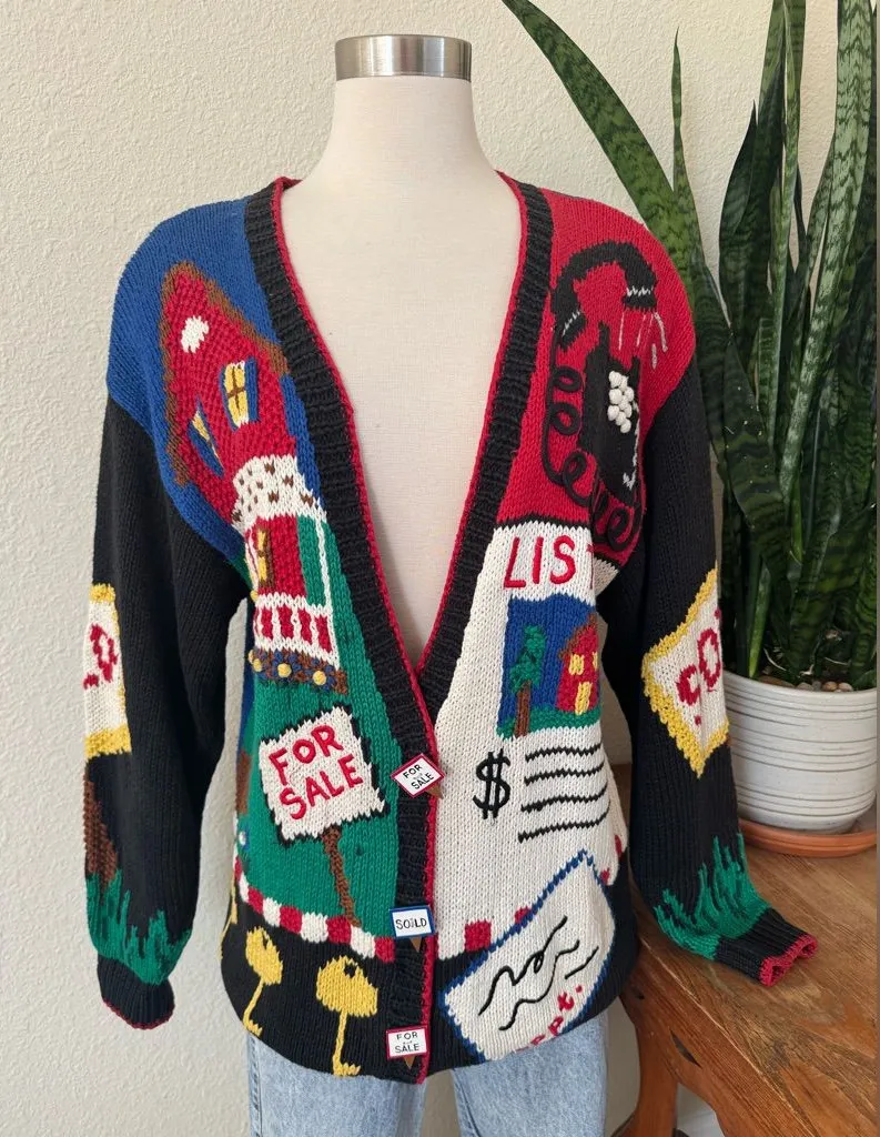 Unique vintage Belle Pointe cardigan featuring vibrant house, telephone, and real estate “For Sale”... Show more