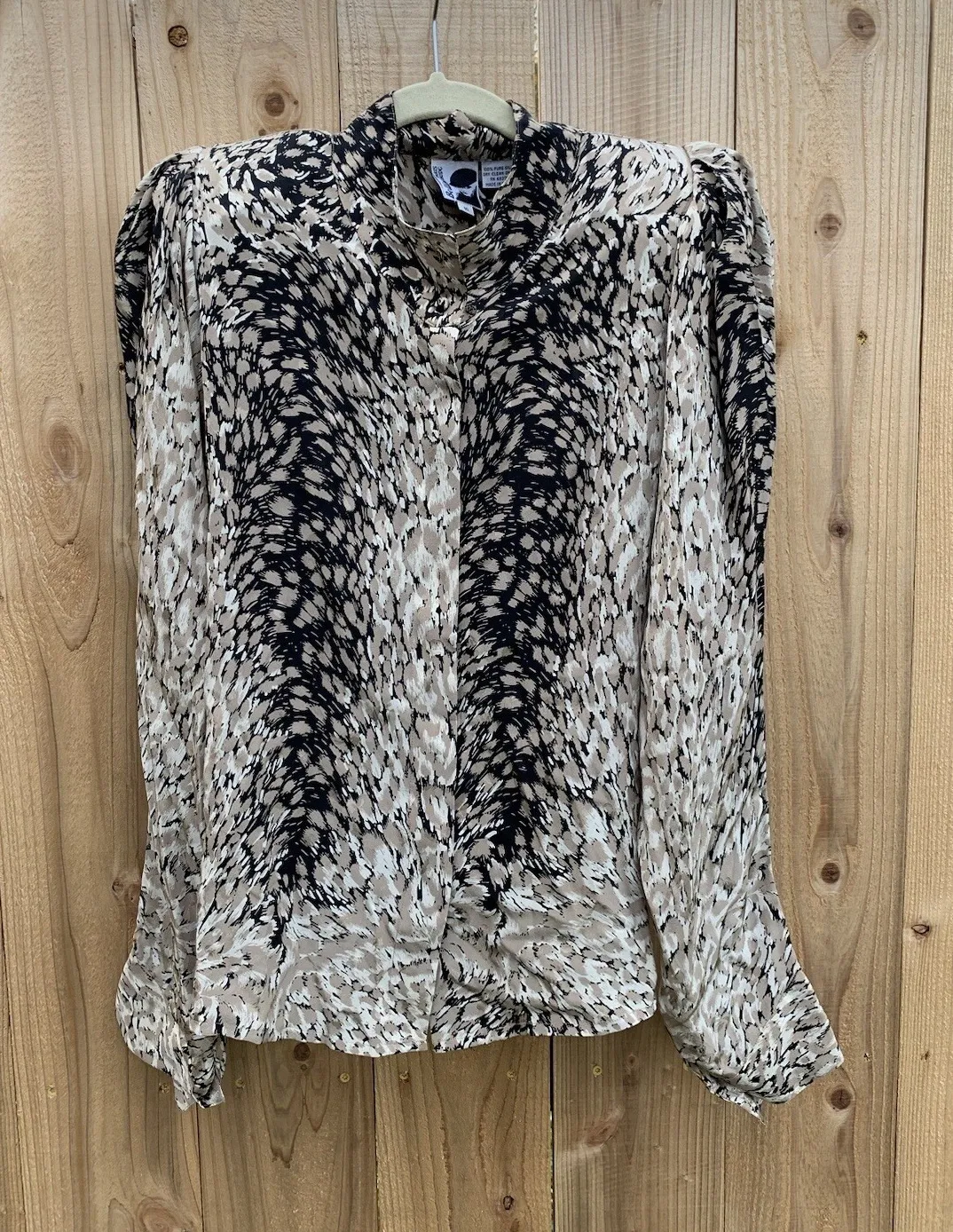 VINTAGE BELLINO PARIS MODE animal print long sleeve button up size 10. Preowned good condition. 100% silk, has shoulder pads. 20 in pit to pit, 24 in top to bottom, 22 in sleeve inseam. Ships in 1-4 days 👽 I have a bunch of clothing for sale!! Make a bundle & will give you a great deal, shipping automatically combines to one price at checkout:)