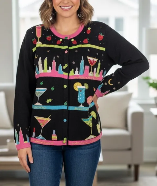 VINTAGE Berek Margarita City ugly grandma Sweater Black Colorful Cardigan Hand Knit 90s M. Perfect for girls night out Night on the town Bachelorette party New Year’s Eve Kawaii
