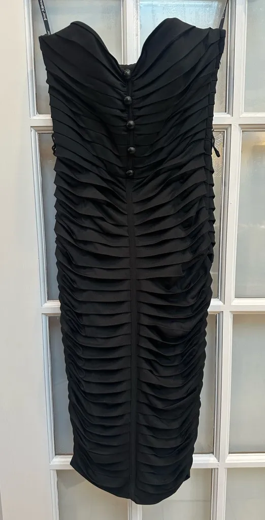 This timeless black strapless dress features a chic ruched design, perfect for any formal occasion.... Show more