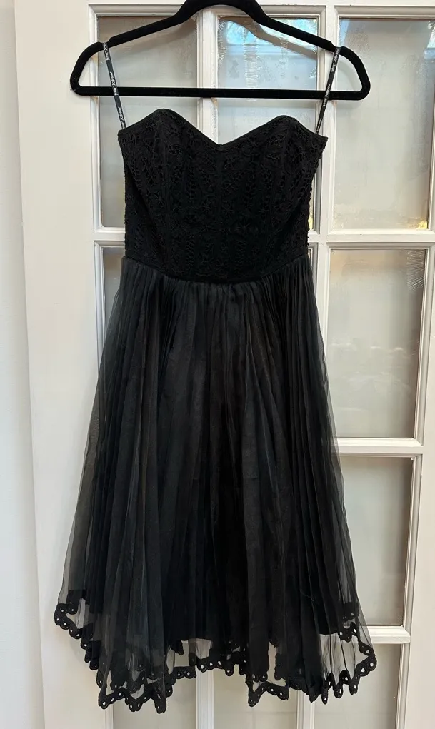 Charming black lace dress. Perfect for formal events. Features a delicate lace bodice and flowing sk... Show more