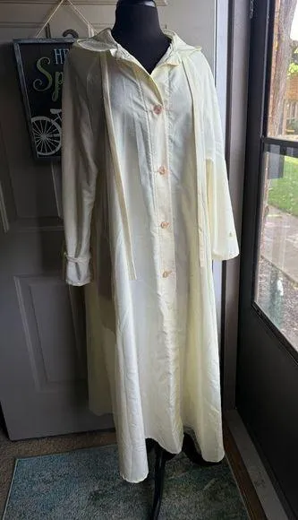 Good, vintage condition. Hooded. Button down front. Care tag is rubbed off, union made. Made in the USA. Left sleeve is missing wrist tie. No visible holes or stains. Please see all pictures. Selling as is. One size. Pit to pit is approximately 24” across laid flat. Length is 51”. Dry clean recommended. Color ecru. From smoke/pet free home. Reasonable offers welcome!
