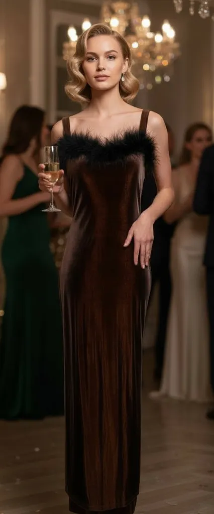 Vintage Beware Copper Velvet Feather Trim Midi Dress Size medium Style 2936-2V Copper rust brown velvet with black feather trim Slits on each side Condition: excellent Party dress cocktail event holidays nye black tie formal fall wedding guest dress