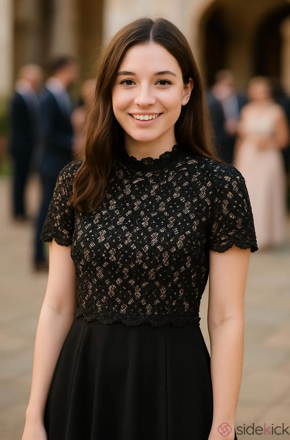 Elegant all in one piece black lace top with matching dress underlay. Gold floral lace and beaded up... Show more