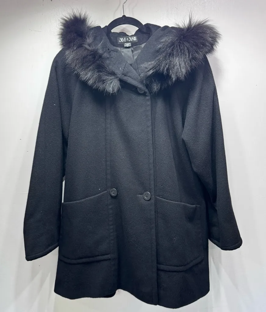 Vintage Black Double Breasted Swing Coat Faux Fur Lined Hood by Steve & Searle. Big patch pockets. Made in the USA. Women’s size XL by measurements, brand size is 2. Good condition with flaws: holes inside hood and small pinhole in pocket, see pictures. Clean, smoke free home and studio. Five star seller. Super fast shipping! Bundle 2+ items for 20% off! Measurements 22” armpit to armpit 34” length *measurements are approximate SKU# 251059 R5