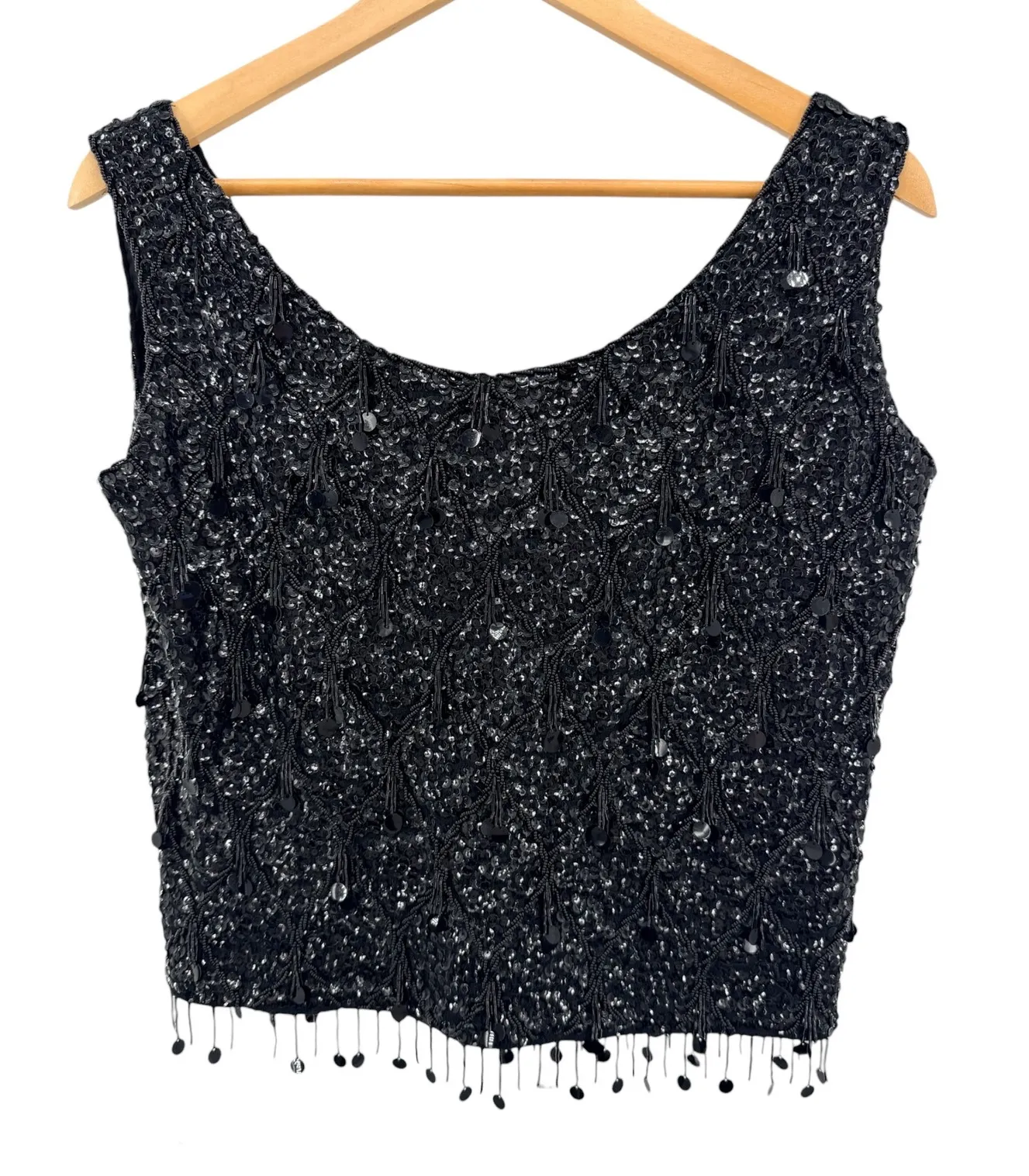 This is a stunning vintage hand-beaded evening crop top featuring dense black sequin embroidery, dangling fringe bead hem, and a fully silk-lined interior. The craftsmanship is exceptional, with intricate beadwork forming elegant cascading patterns across the entire bodice. Made in the British Crown Colony of Hong Kong, a hallmark of high-quality vintage eveningwear production, this piece reflects classic couture-style construction from the golden era of hand-embellished garments. Features: • Fully hand-beaded sequin design • Dramatic beaded fringe hem • Sleeveless cropped silhouette • Back zipper closure • Silk lining for comfort and structure • Vintage Hong Kong manufacture Measurements (laid flat): Length: 21" Pit to pit: 19" This top is perfect for eveningwear, cocktail events, festival styling, vintage glamour looks, or modern layered outfits over sheer blouses or dresses. Condition: Excellent vintage condition with light natural wear consistent with age. Beadwork intact and secure. A rare and highly collectible statement piece. Vintage Cocktail Evening Festival Y2K Glam Couture Style Beaded Fringe Sequin Keywords: beaded top, sequin top, fringe top, glam, evening wear, party top, vintage fashion, statement piece, formal, special occasion, cocktail attire, art deco inspired, gala, disco