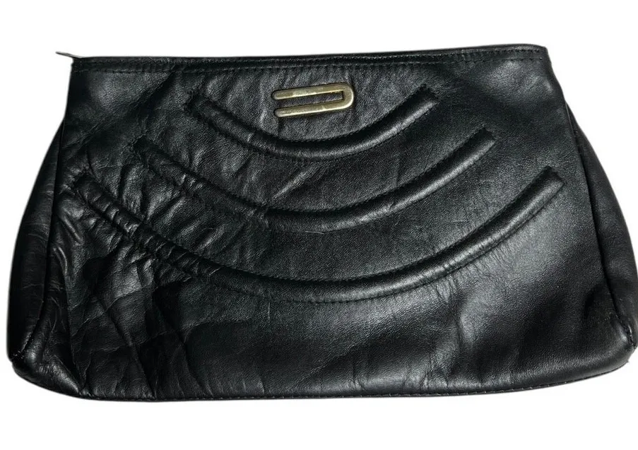 Classic vintage black genuine leather clutch with stitched arc detail and sleek minimalist design. A timeless piece perfect for evening wear, cocktail parties, weddings, or as a retro Y2K accessory. Lightweight, structured, and chic — fits essentials like phone, keys, lipstick. Measurements: Width: ~12 in Height: ~7 in Slim profile Features: 100% genuine leather Clean retro silhouette Soft, supple feel Gold-tone hardware accent Secure top zipper closure Preowned vintage black genuine leather clutch. Minimalist retro Y2K style with stitched arc detail, gold-tone accent, and top zip. Clean inside/out with light vintage wear. Classic evening bag, fits phone + essentials. Keywords: vintage clutch purse, black leather handbag, minimalist evening bag, Y2K retro style, quiet luxury accessory.