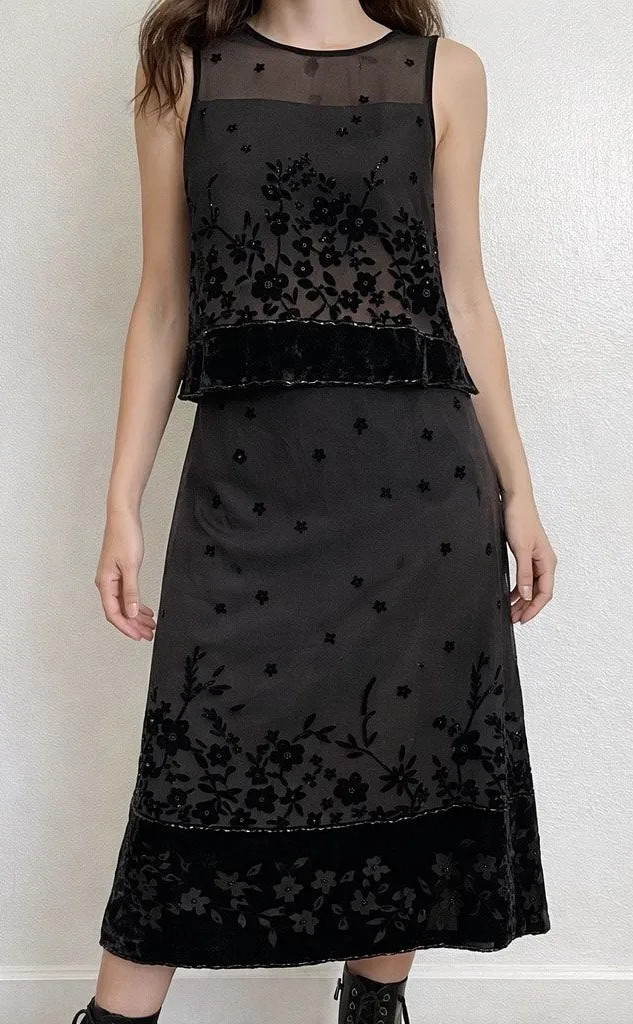 Vintage two piece set featuring a sheer black silk velvet burnout tank with button-back closure and a matching midi skirt. Romantic floral burnout with subtle sequin detailing throughout. Lightweight, floaty, and ideal for styling together or separately. The button-down back adds a true late 90s to early Y2K vintage detail and elevates the silhouette. This set reads dark feminine, fairy goth, and modern when styled with boots or ballet flats. Top: sleeveless sheer silk velvet burnout with buttons down the back Skirt: midi length with back zipper closure Fully lined for comfortable wear but sheer. Brand: Silk Club Collection Fabric: Shell 75% silk, 25% rayon. Lining 100% polyester. Condition: Vintage, very good condition. No visible flaws noted. Tagged P/12 (vintage sizing). Based on measurements, fits like a modern US size 6. Please refer to measurements for best fit. Waist 14” flat, 28” Pit to pit 18” flat. This is an ai created modeled photo to see the style visual. Check all the photos to be clear on the actual item.