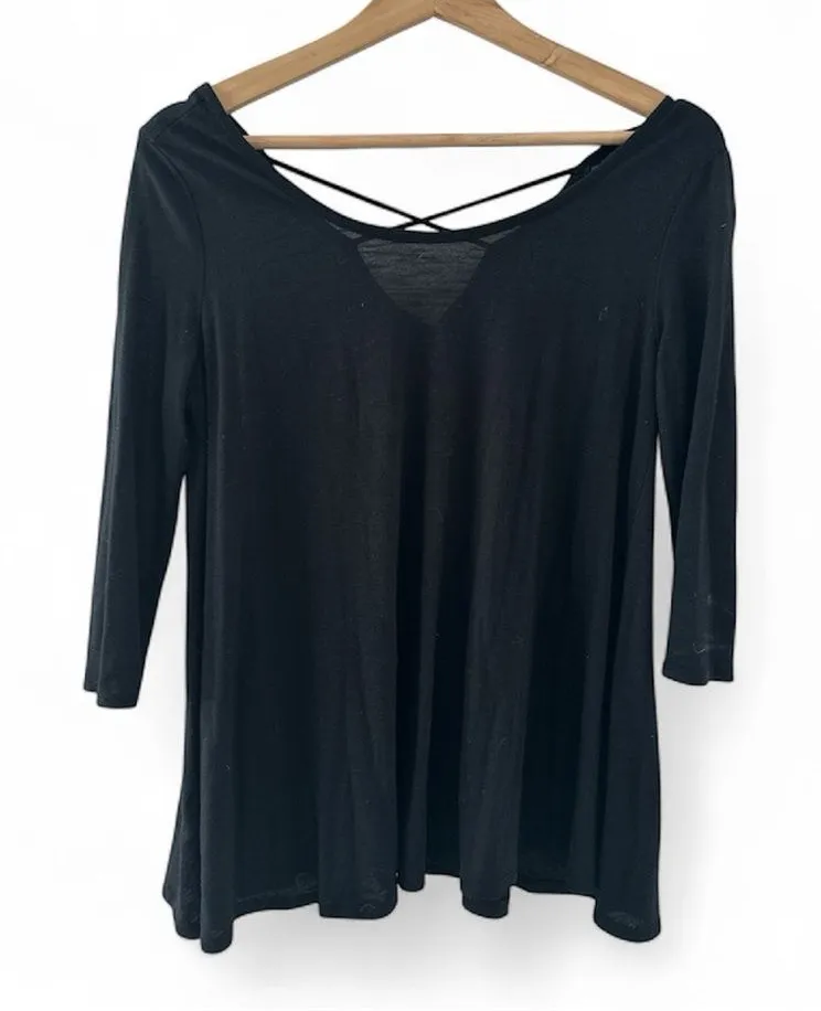 Love by Design Vintage Black Back Cutout Top Women’s Small — Y2K Soft Stretch Rayon Blend For lovers of effortless Y2K fashion, this black swing top blends comfort and style in a way that feels timeless. The soft rayon-poly fabric drapes beautifully with a fluid, flattering shape, while the back features a delicate crisscross cutout detail that adds subtle edge. Perfect for layering or wearing on its own with jeans or a mini skirt. Details: • Brand: Love by Design • Size: Small • Color: Black • Material: 53% Rayon, 47% Polyester • ¾ sleeves, flowy fit, crisscross back cutout Approx. measurements (laying flat): • Underarm to underarm: 19 in • Hem width: 36 in • Length: 26 in Condition: Gently pre-owned, excellent shape Y2K black top, minimalist, Love by Design, open back top, vintage stretch knit #Y2KStyle #VintageBasics #MinimalChic #SoftStretch #EverydayLayer