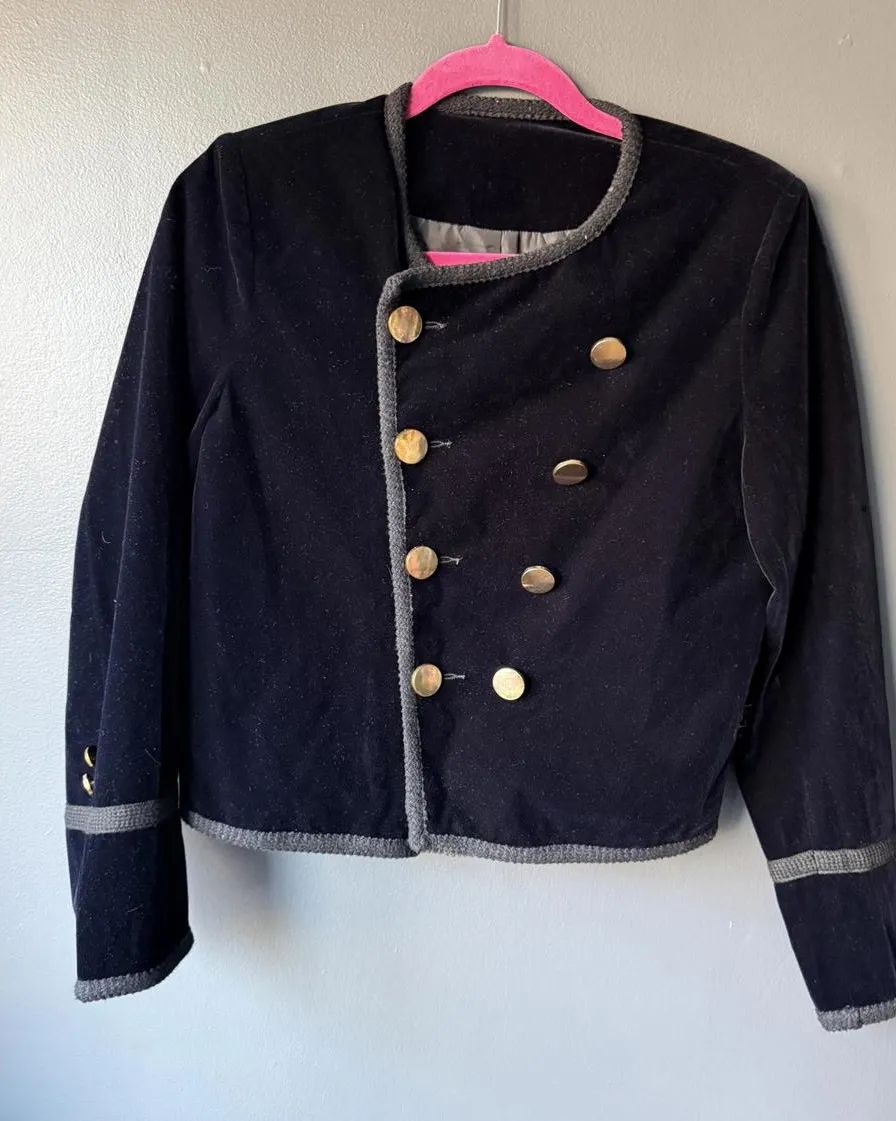 Black women's jacket featuring a military-inspired design with gold-tone buttons. Trimmed with gray... Show more