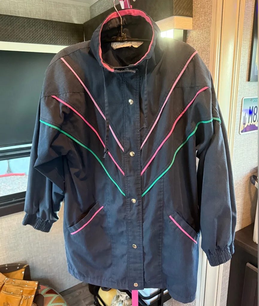 Navy jacket by Blair with vibrant pink and green accents. Ideal for a bold style statement. This is such a cute piece that I wore a few times I liked to pair it with modern rock, T-shirts, funky jeans, and scarfs - they do tiny shoulder pads that are sewn in that I personally liked and usually don’t like any shoulder pads. Freshly washed free and clear comes from a non-smoking, hypoallergenic, pet friendly RV life home.