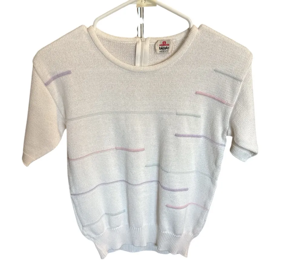 Vintage Bleyle knit top made in Japan. Soft white knit with subtle pastel stitch accents and back zip closure. Lightweight and easy to style with denim or skirts. • Pit to pit: 17” • Short sleeves • Vintage, likely 70s–80s • Good vintage condition Keywords: vintage knit, bleyle, made in japan, pastel sweater, retro top, minimalist vintage