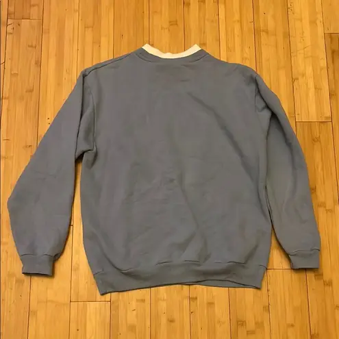This blue crew neck sweater showcases a captivating winter scene with snow-covered trees and a cozy cabin, set against a muted blue backdrop. The ribbed neckline and long sleeves add a touch of classic style, making it a perfect choice for chilly days.