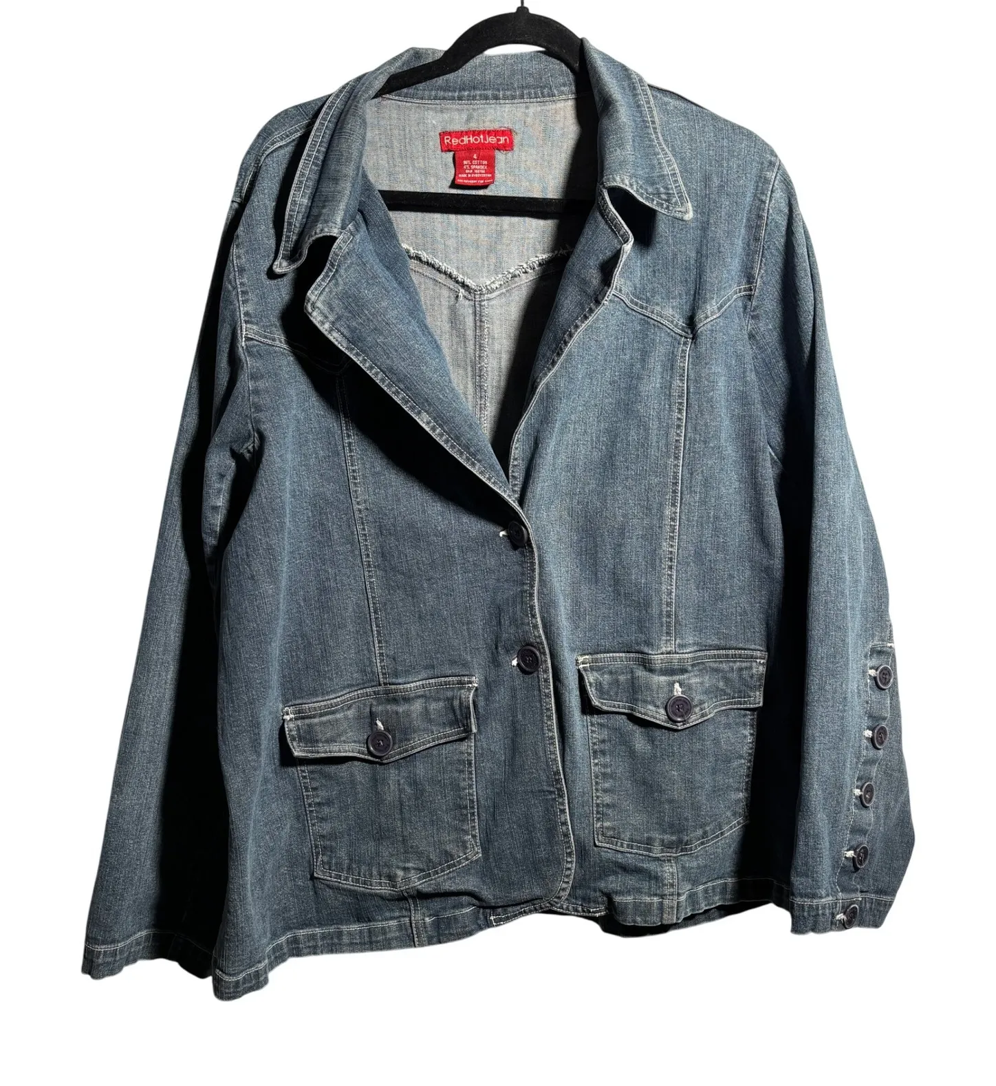 Measurements: • Chest (across): 27.5 in • Length: 27.5 in Keywords: denim blazer, jean jacket, womens blazer, size 4XL, redhotjean, button front, pockets, casual jacket, denim coat, lightweight jacket, retro style, cotton blend vtg buttons collared Y2K 90s jean jacket distressed office Please see photos for details. Offers welcome!