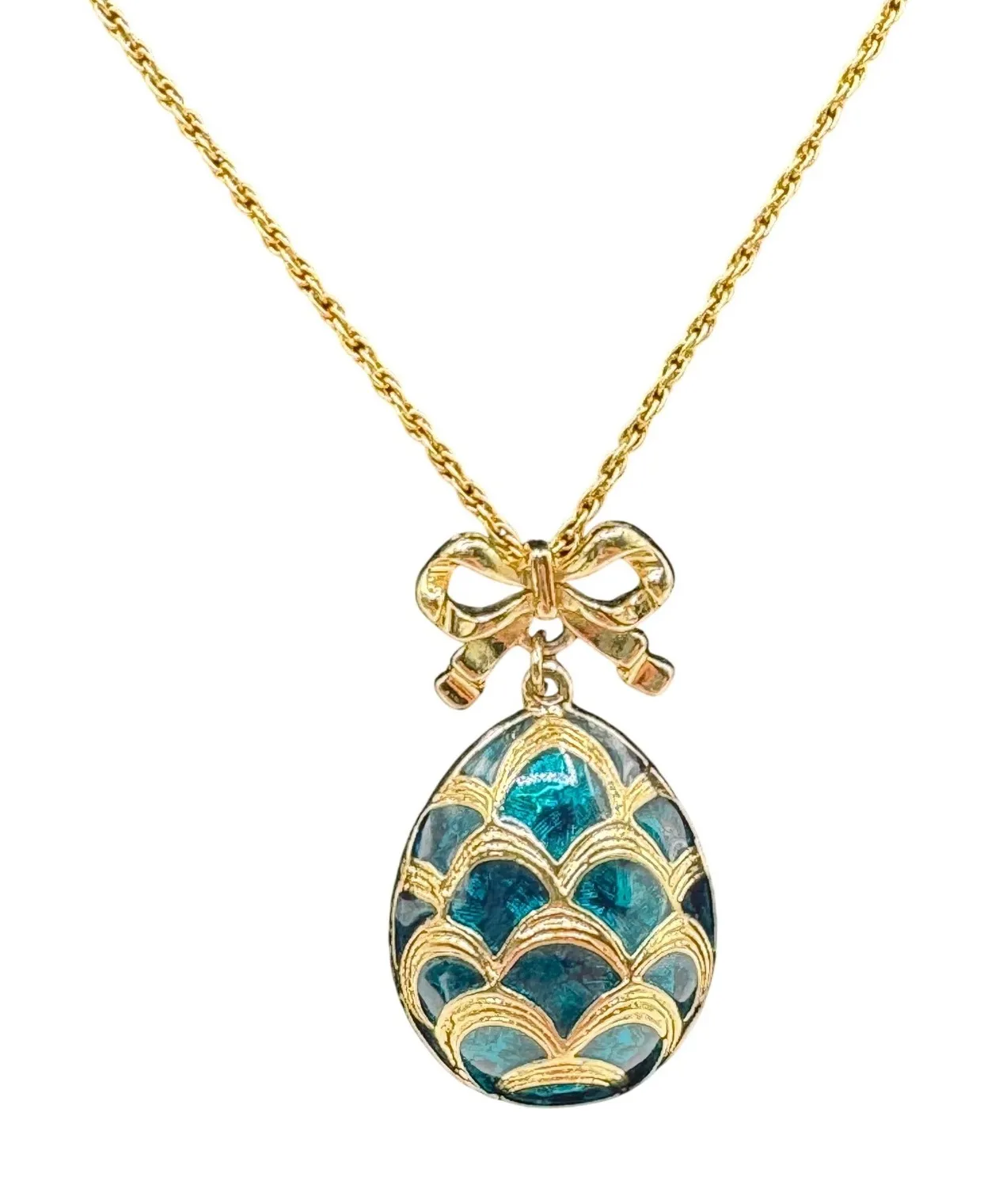 Description: Vintage gold tone necklace featuring a decorative blue enamel egg pendant with layered scalloped detailing and a feminine bow accent at the top. The pendant has a rich teal-blue enamel finish with dimensional gold tone overlays, giving it a classic, ornate look. Necklace is finished with a lobster clasp closure and hangs beautifully when worn. Approximate chain length: 18 inches Pendant length: approximately 1.25 inches Vintage condition with light surface wear consistent with age. No major flaws noted. Due to color variations with photos and computer screens, exact color matches cannot be guaranteed. Keywords: vintage necklace, enamel pendant, statement jewelry