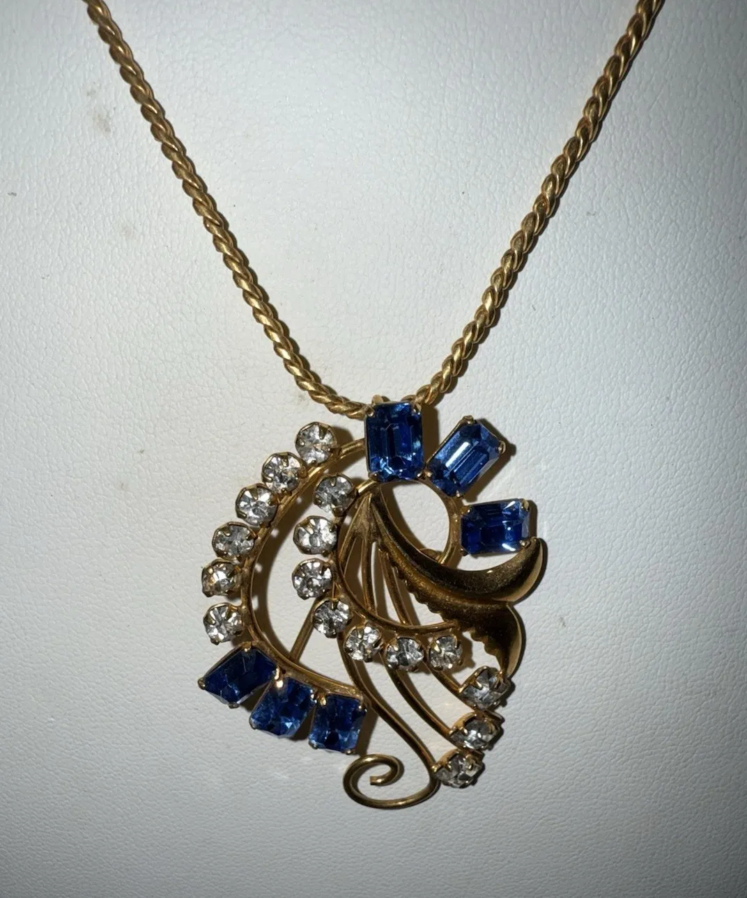 Vintage Blue Rhinestone Brooch Pendant Swirling Spray Gold Tone 18" Chain Signed - $80 - From ivette