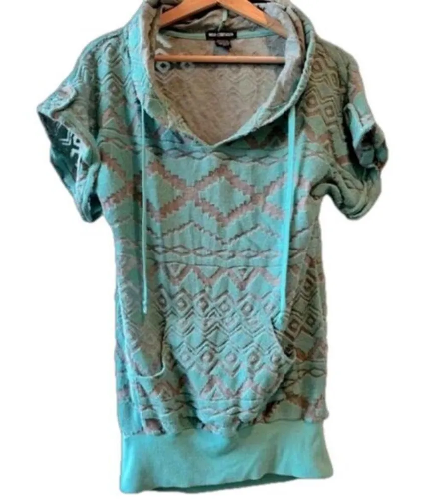 Vintage aqua terry cloth hoodie medium short sleeve hip length Y2K gray 90s Vintage turquoise & gray terry cloth hip length short sleeve size medium hoodie found in good condition. Turquoise material is terry cloth and grey material is thin and breathable. Geometric pattern, front pocket, cute button sleeve detail. Miss Chievous brand. Tags: bodaycon, Weekend, relax, plane clothes, travel, brunch, yoga, beach, hipster, biking, spring, fall, summer, work at home, soccer mom, college classes, errands, aqua blue, cozy, vsco, surfer, skater, Athletic, sporty, retrosport, gym, workout, gorpcore, activewear, utility, practical, granola girl, hiking, camping, outdoor, running, jogging, walking, basketball, practice, yoga, trail, pilates, Athleisure, lounge, soft, relaxed, casual, around the house, comfy, comfortable, cozy, stretchy, stretch, plush, pajamas, PJs, sleepwear, Y2K