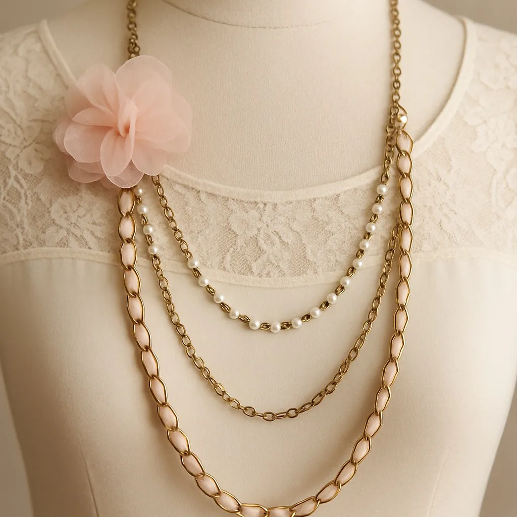 Add a touch of soft vintage romance to any outfit with this beautiful layered chain necklace, featuring a delicate blush fabric flower accent and faux pearl detailing. This piece captures a timeless, feminine aesthetic that’s perfect for lovers of vintage, cottagecore, and romantic styles. The gold-tone chains are layered for dimension, and the floral accent adds a unique statement while remaining lightweight and wearable. Details Length: Approximately 17 inches Design: Layered gold-tone chains with faux pearls Accent: Soft blush fabric flower detail on the side Materials: Gold-tone metal, faux pearls, fabric Style: Vintage, romantic, shabby chic, Condition: Very good vintage condition; minor wear consistent with age Why You’ll Love It Unique statement piece with a soft, feminine vibe Lightweight and comfortable for all-day wear Perfect for dresses, blouses, bridal showers, garden spa