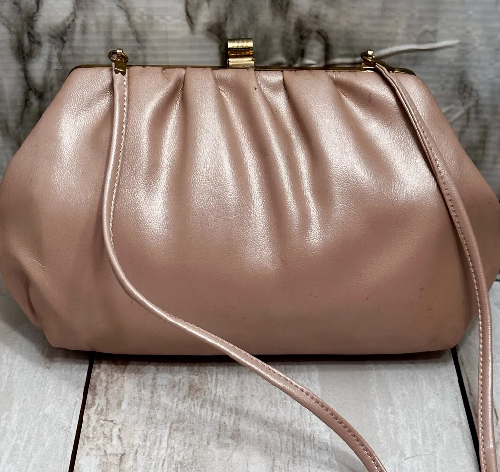 Chic blush leather clutch with a sleek design. Features a gold clasp and matching strap. Perfect for... Show more
