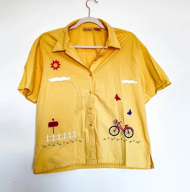 Vintage Bobbie Brooks Yellow 100% Cotton Shirt with Embroidery Large Excellent condition This vintage Bobbie Brooks shirt is a delightful piece that evokes the charm and simplicity of bygone summer days. This shirt, with its soft cotton fabric and intricate embroidered details, captures the essence of leisurely bike rides and the joy of chasing butterflies in the meadow. Button front closure Short sleeves Collared Lightweight and airy Crepe-like fabric Approx measurements, flatlay: Pit to pit 20" Length 24" Please allow 2-3 business days for shipping Smoke-free home Dog-friendly home vintage, summer, retro, embroidered, embroidery, nostalgic, cotton, linen, sustainable, beach, travel, comfy, vacation, hamptons, malibu, cali