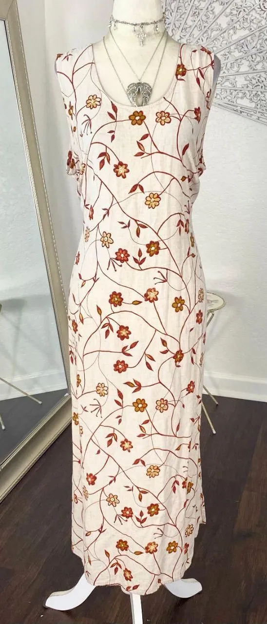 🥀 Boho Cottage Core Floral Linen Midi Dress 🥀 ༓ Brand: R&K ༓ Size: 20 W / XXL ༓ stunning cream nude rayon linen blend straight midi maxi dress ༓ ties in back, adjustable ༓ so stunning, bohemian cottage core fairy whimsical Measurements: ༓ pits 19.5" ༓ single waist 21" , can be tightened ༓ length 37" Tags: #cottagecore #boho #fairy #whimsical #granola