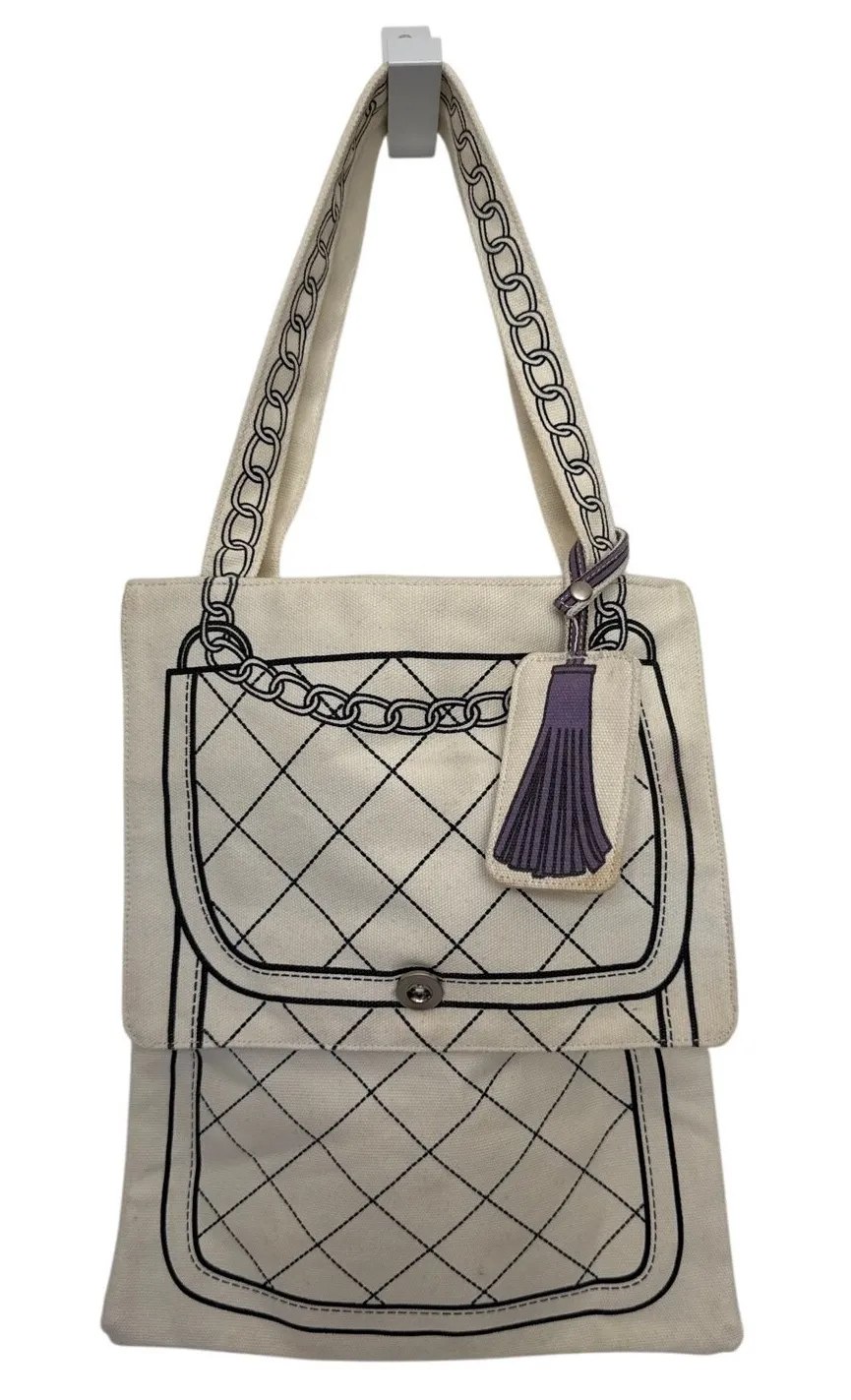 Rare Borders Books & Music illustrated tote — features a printed quilted purse design with chain strap detail and tassel charm. Made of sturdy 100% cotton canvas with a magnetic snap closure and double shoulder straps. Fun optical-illusion bag that blends bookish nostalgia with quirky Y2K style. Great everyday tote or collector’s piece for Borders fans Measurements are approximate •Height 14.5” when folded and tied 9” •Length 12” •Strap drop 9.5” double strap In good pre owned condition. Some odd blemish as shown Any questions please ask. •Same day shipping or next •Bundle discount available •Five star seller