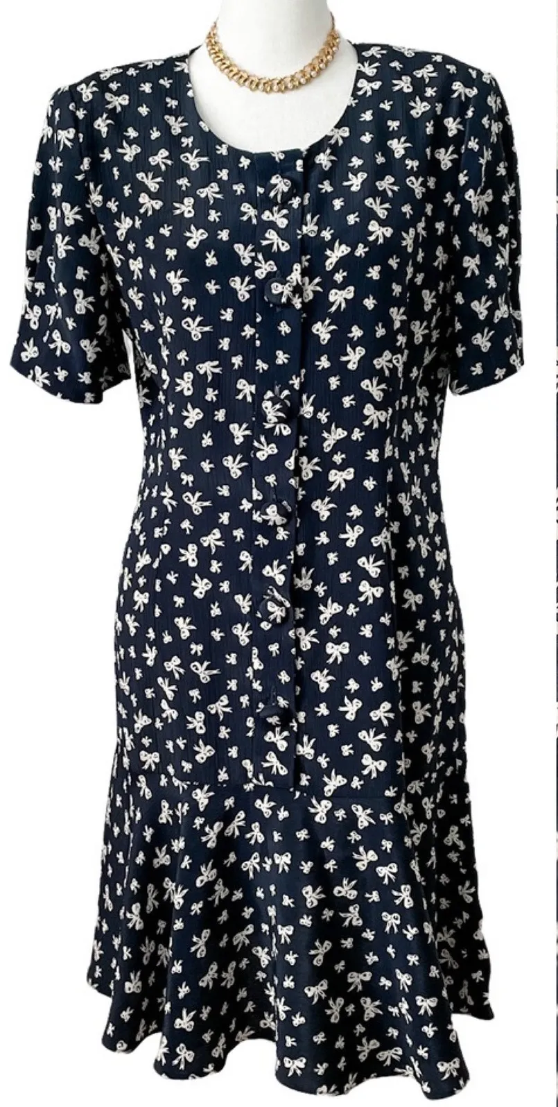 The absolute CUTEST dress you’ve ever seen - vintage drop waist dress with a flounce skirt in a navy blue and white bow pattern with original matching covered buttons! Fantastic shoulder pad action. Vintage 80s/90s does retro perfection Measures flat approximately Shoulder ~14.5” Chest 18 Waist 15.5 Hip 18.5 •Size: fits modern S/SP 4/6 •Condition: Excellent vintage •Color: navy & white Bundle for combined shipping! Pictures are part of the description. Color may vary by screen. Smoke free, DOG FRIENDLY home. Tags: vintage secretary mid century feminine button down 50s 60s retro preppy flapper style 80s 90s fashion novelty print cottagecore romantic whimsical flirty girlie soft girl garden party brunch dress picnic outfit rehearsal dinner vacation dress sustainable fashion thrift core retro chic antique vibe eclectic wardrobe statement piece feminine aesthetic vintagecore y2k revival pattern play nostalgic look fashion collectible era piece