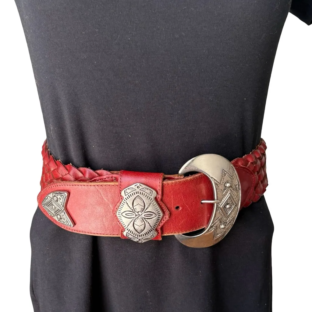 Vintage braided wide leather belt that is wide with large silver buckle and silver tip. The belt is a finely braided dark red leather and buckle is etched silver.. Triangular silver tip. Unique piece that will never go out of style. Marked made in Mexico. Size: Medium 37.5” total length 29.25” to first hole, 31.25” to last hole 2.25” Wide Pre-owned, good vintage condition - has some marks and light scratches and some color wear on the edges.