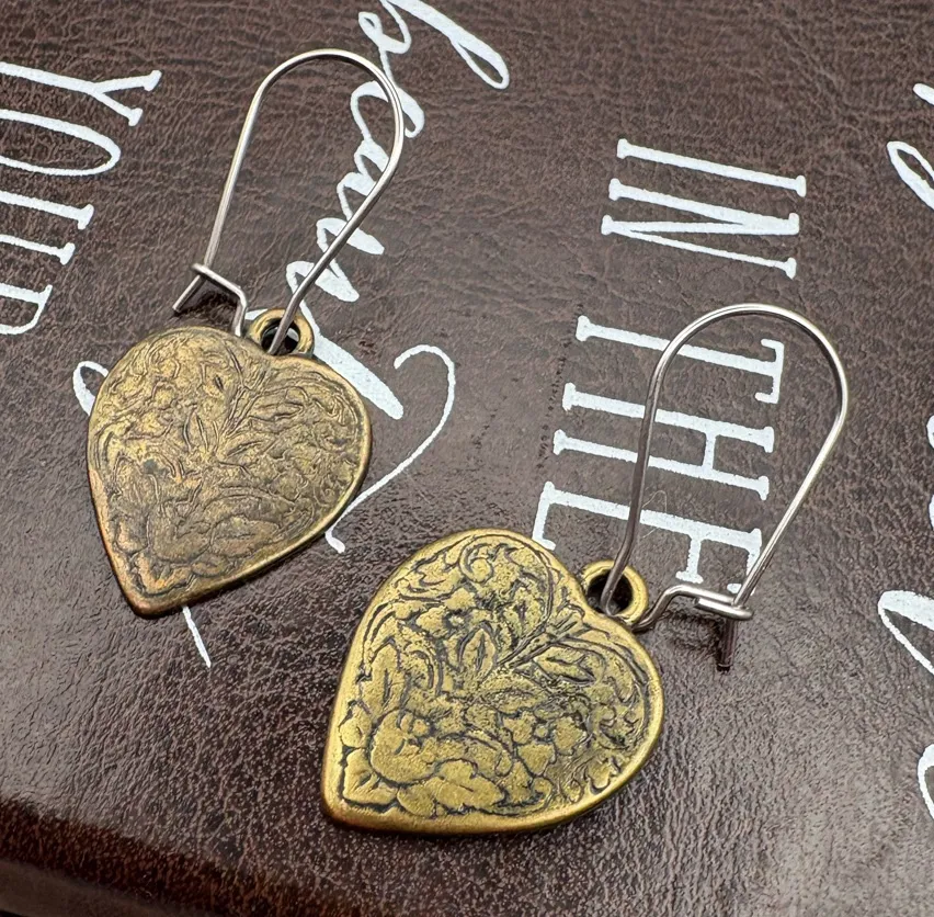 Vintage brass floral heart earrings upgraded with new stainless steel hooks for modern wear and durability. Lightweight and charming — the perfect romantic accent for everyday outfits or gifting. Details: • Vintage heart charms with floral engraving from 1950 charms • Stainless steel ear wires (great for sensitive ears) • Brass tone • One-of-a-kind upcycled jewelry